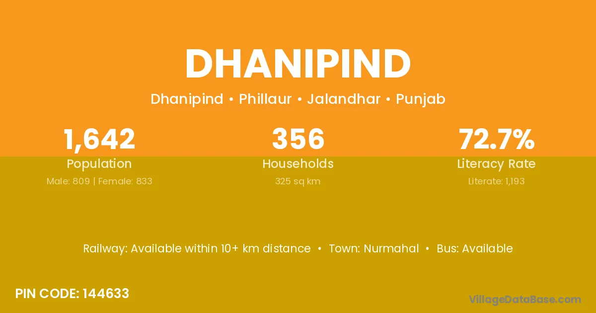 According to Census 2011 information, the village code of Dhanipind village is 144633.