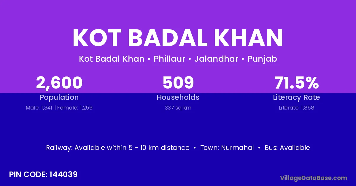 Nurmahal is the nearest town to Kot Badal Khan village for major economic activities