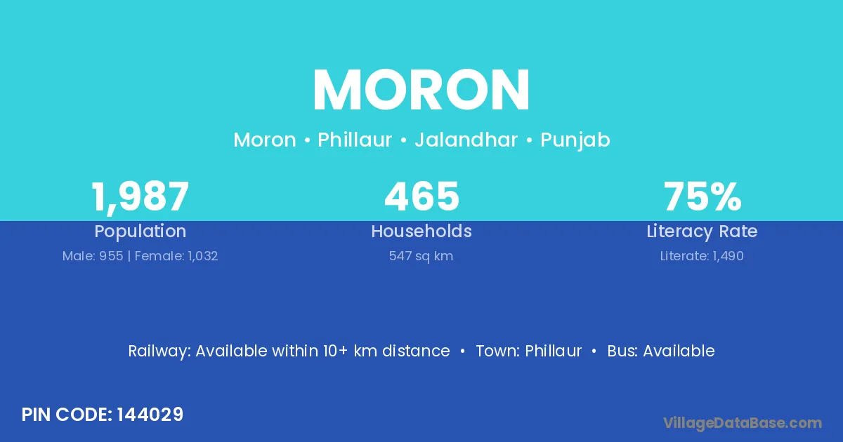 Moron village has a total population of 1,987 people, of which 955 are males and 1,032 are females.