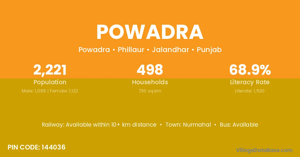 Powadra village has a total population of 2,221 people, of which 1,099 are males and 1,122 are females.