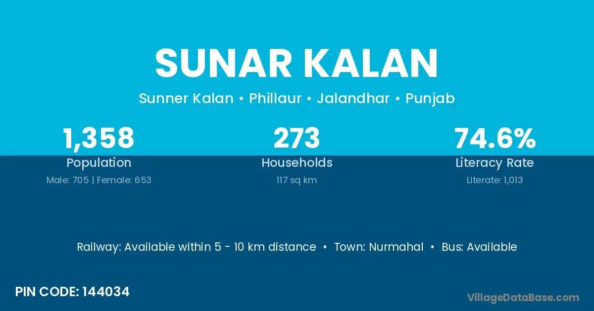 Sunar Kalan village has a total population of 1,358 people, of which 705 are males and 653 are females.
