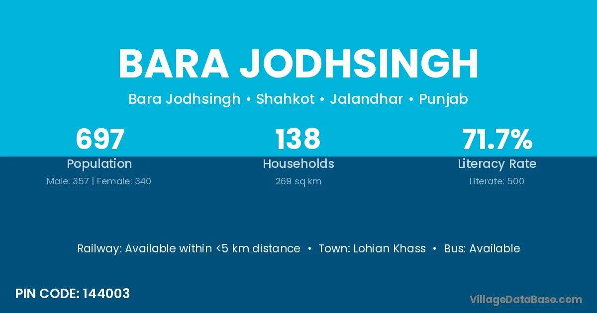 Bara Jodhsingh village has a total population of 697 people, of which 357 are males and 340 are females.