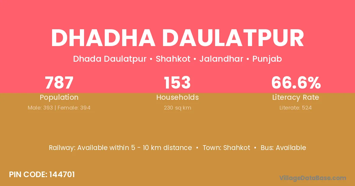 Dhadha Daulatpur village has a total population of 787 people, of which 393 are males and 394 are females.