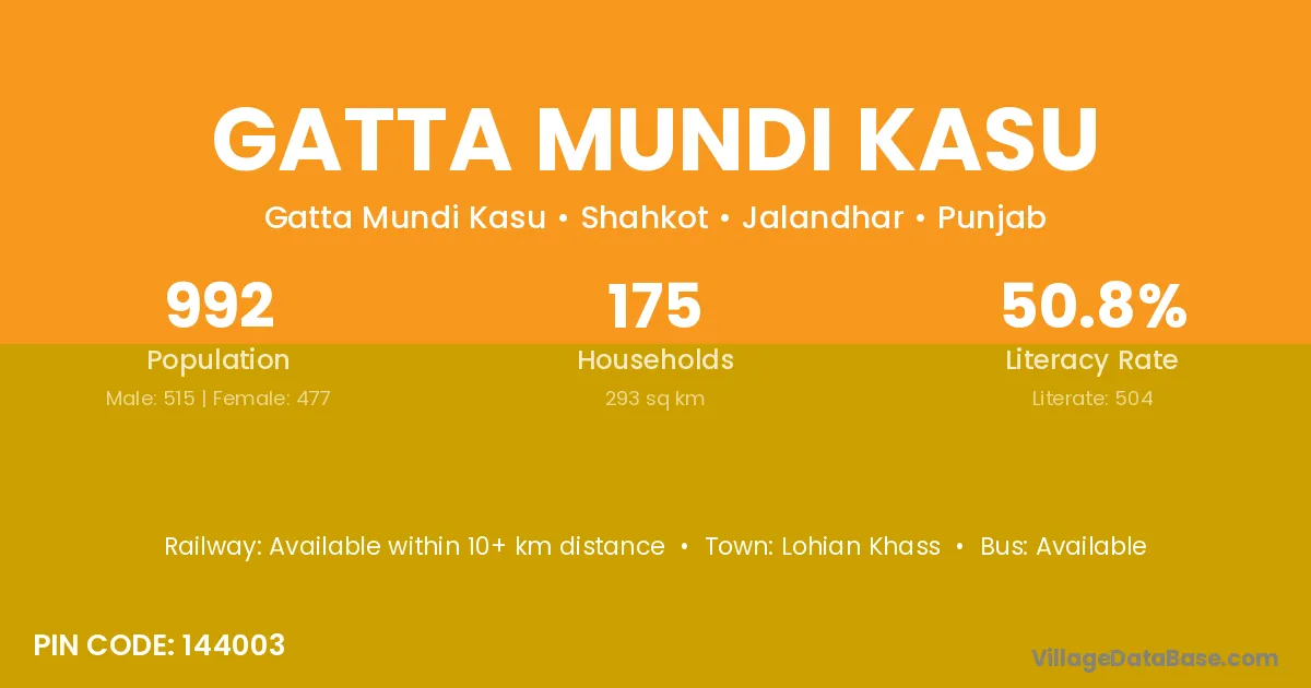 Gatta Mundi Kasu village has a total population of 992 people, of which 515 are males and 477 are females.