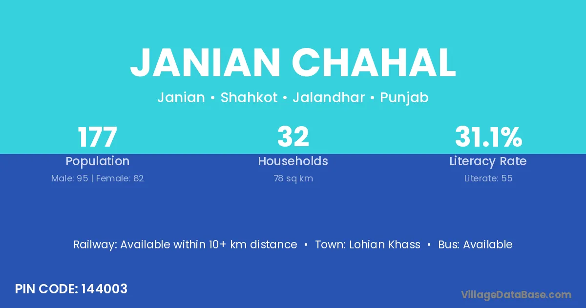 Janian Chahal village has a total population of 177 people, of which 95 are males and 82 are females.