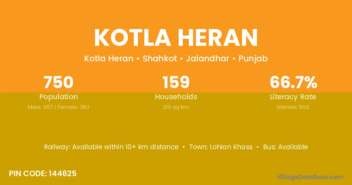 Kotla Heran village has a total population of 750 people, of which 357 are males and 393 are females.
