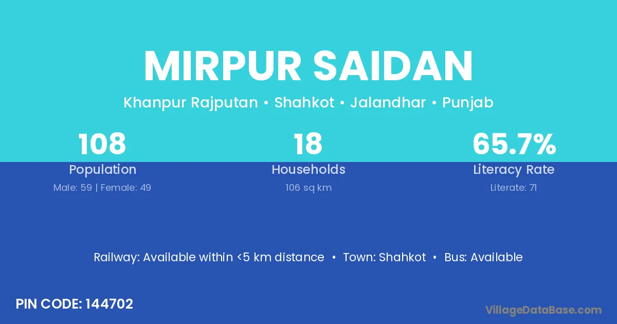 Mirpur Saidan village has a total population of 108 people, of which 59 are males and 49 are females.