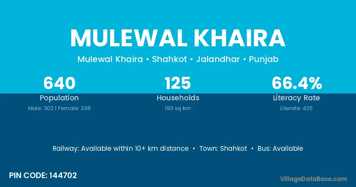 Mulewal Khaira village has a total population of 640 people, of which 302 are males and 338 are females.