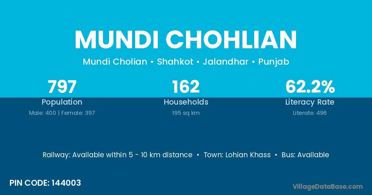 Lohian Khass is the nearest town to Mundi Chohlian village for major economic activities
