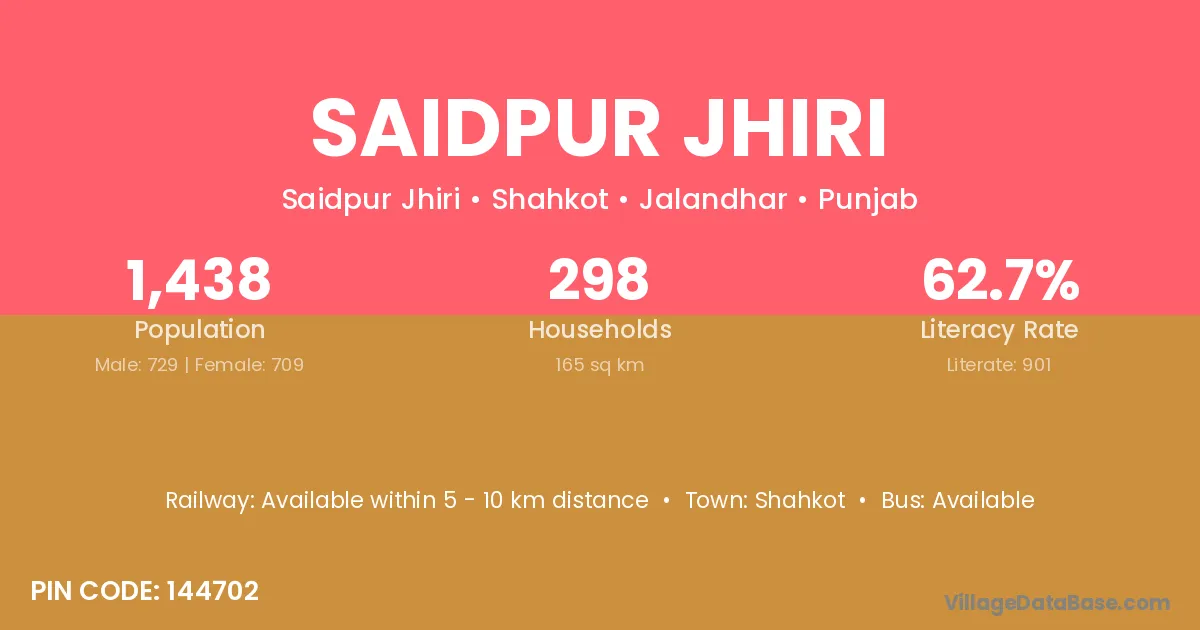 Saidpur Jhiri village has a total population of 1,438 people, of which 729 are males and 709 are females.