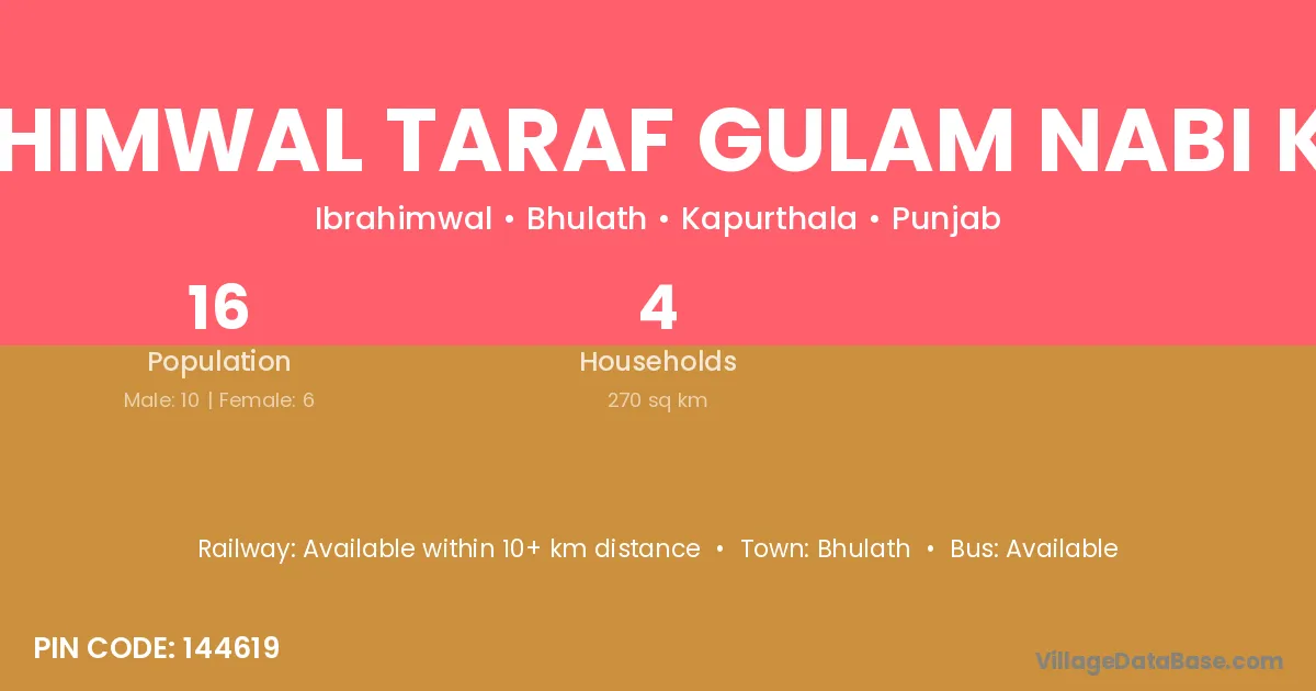 Ibrahimwal Taraf Gulam Nabi Khan village has a total population of 16 people, of which 10 are males and 6 are females.