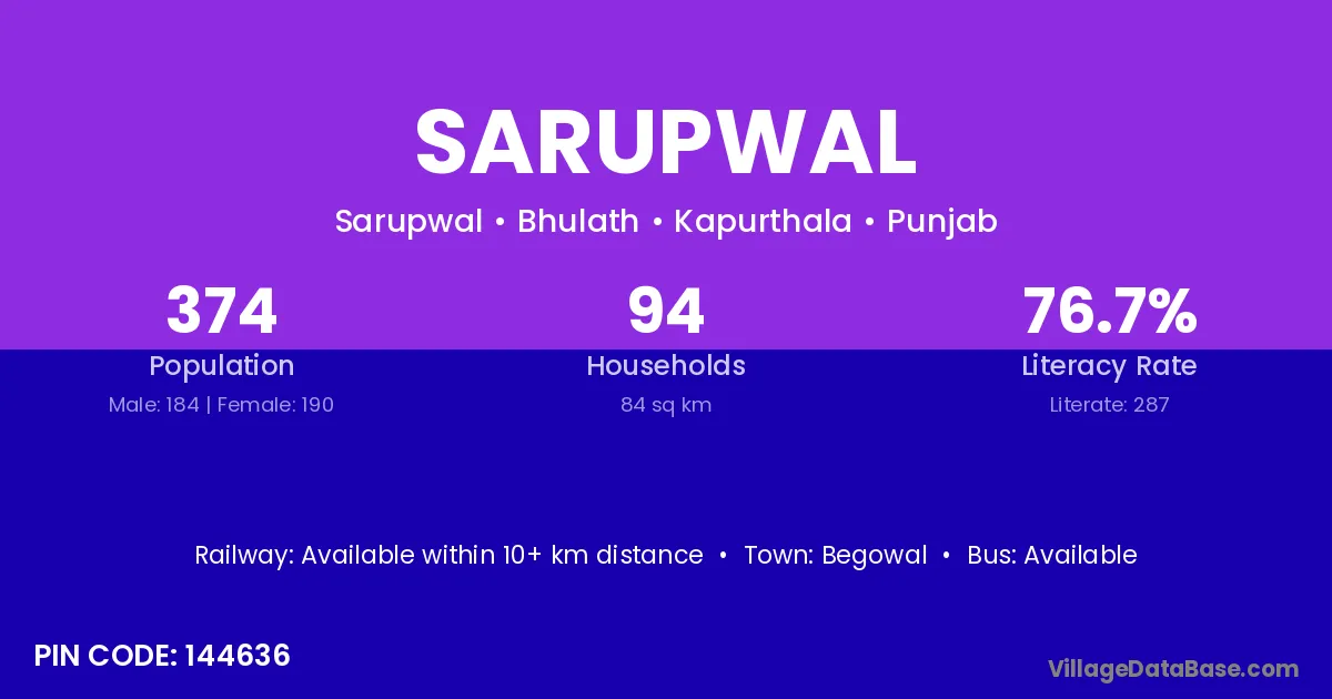 Sarupwal village has a total population of 374 people, of which 184 are males and 190 are females.