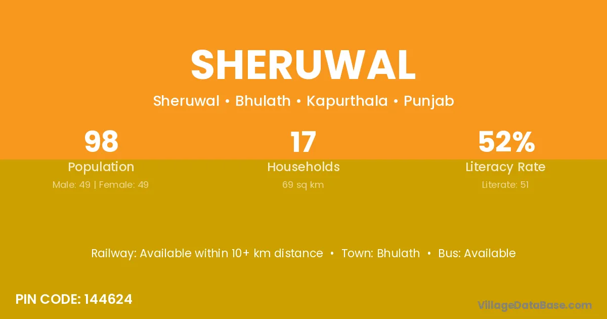 Sheruwal village has a total population of 98 people, of which 49 are males and 49 are females.