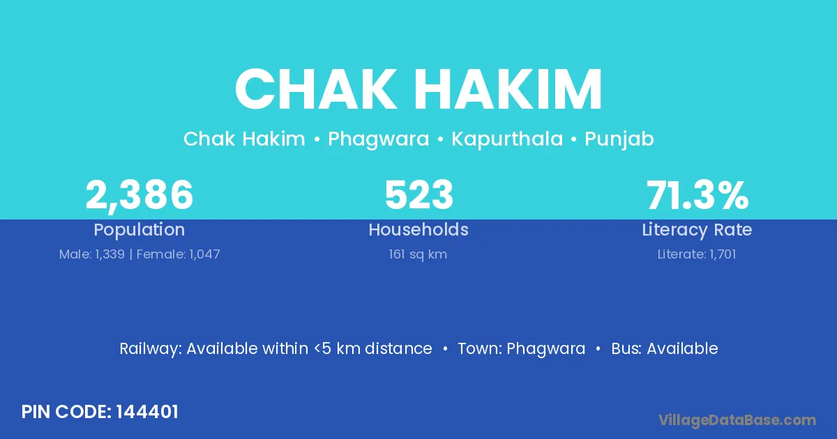 Phagwara is the nearest town to Chak Hakim village for major economic activities