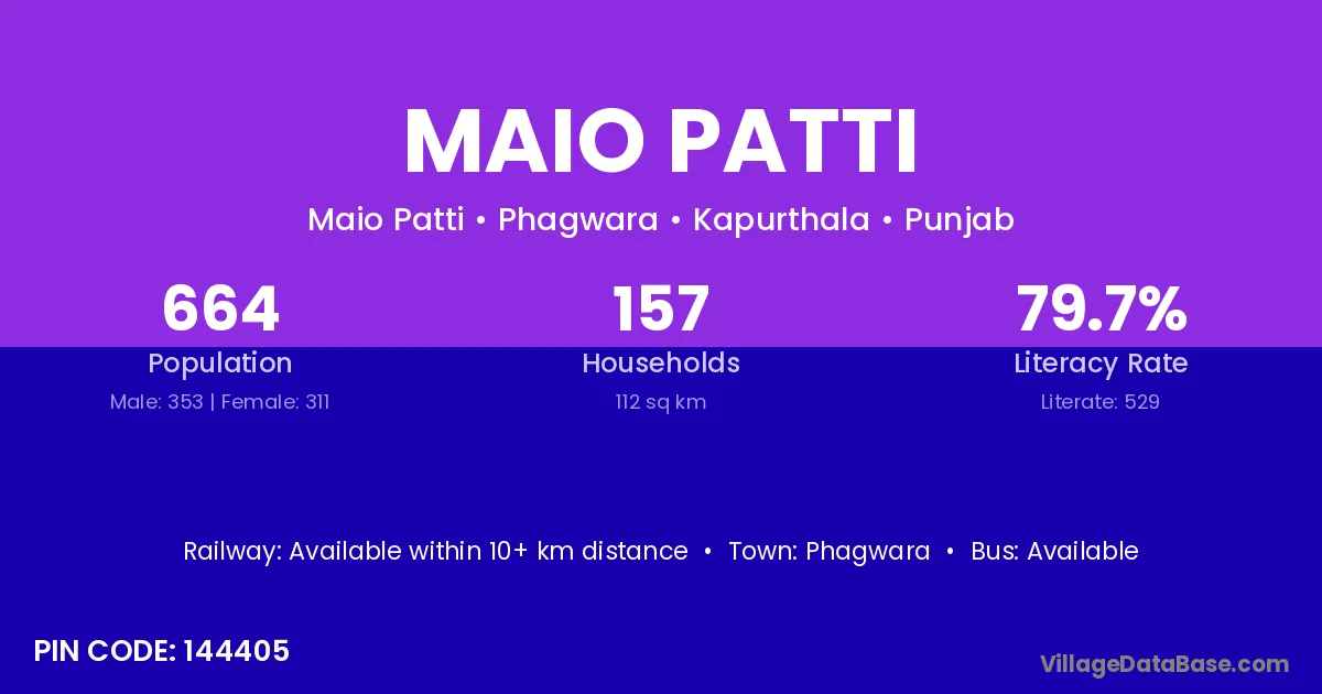According to Census 2011 information, the village code of Maio Patti village is 144405.