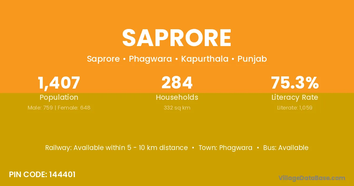 Phagwara is the nearest town to Saprore village for major economic activities