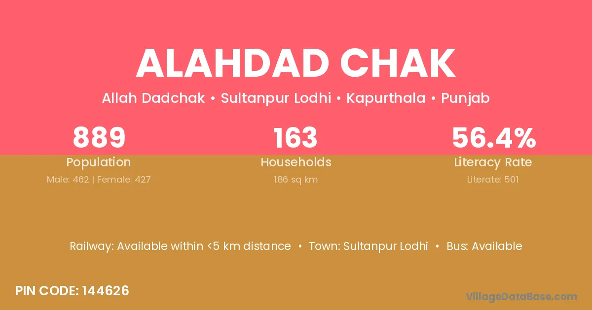 Alahdad Chak village has a total population of 889 people, of which 462 are males and 427 are females.