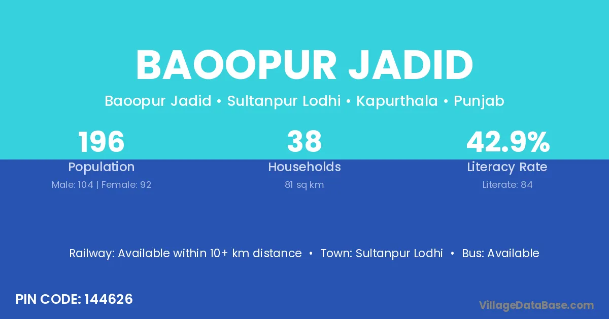 The literacy rate of Baoopur Jadid village is 42.86%. Male literacy stands at 45.19% and female literacy at 40.22%.