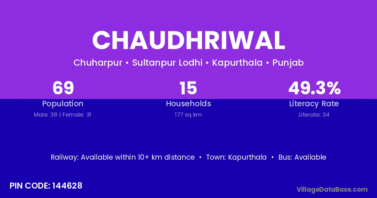 Kapurthala is the nearest town to Chaudhriwal village for major economic activities