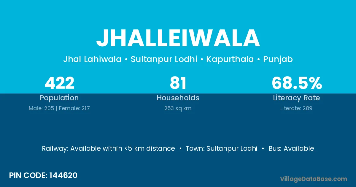 Jhalleiwala village has a total population of 422 people, of which 205 are males and 217 are females.