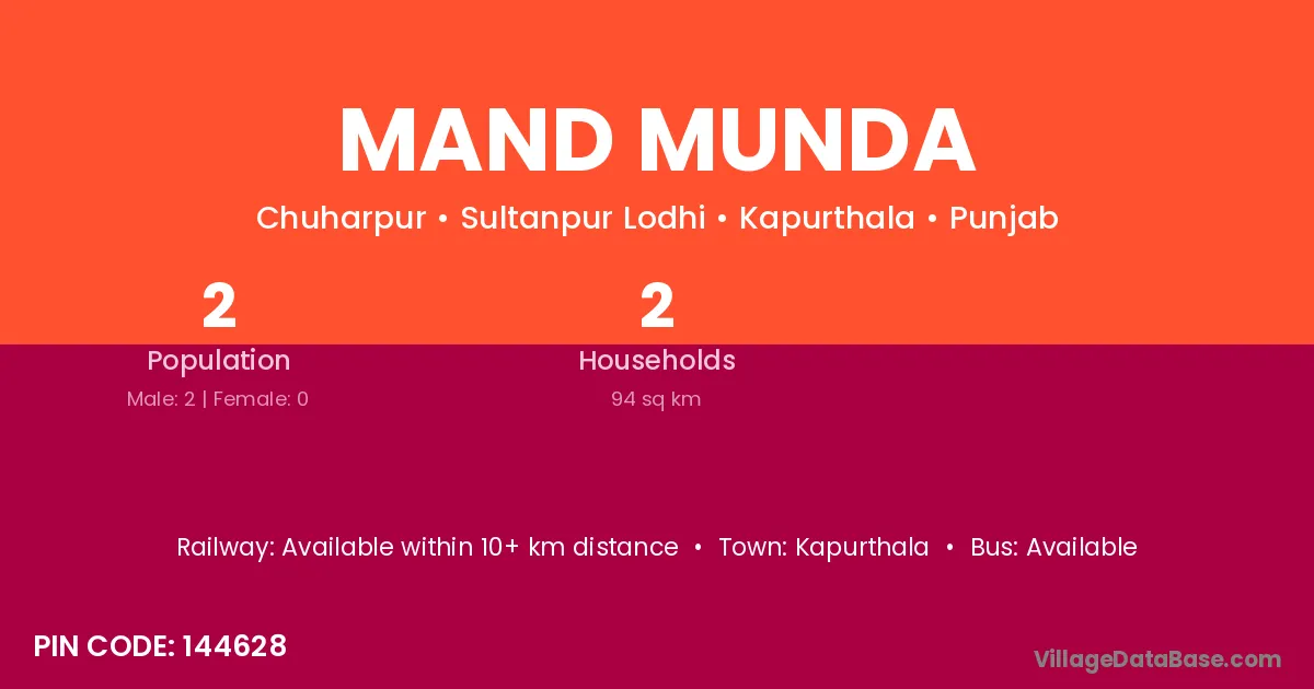 Mand Munda village has a total population of 2 people, of which 2 are males and 0 are females.