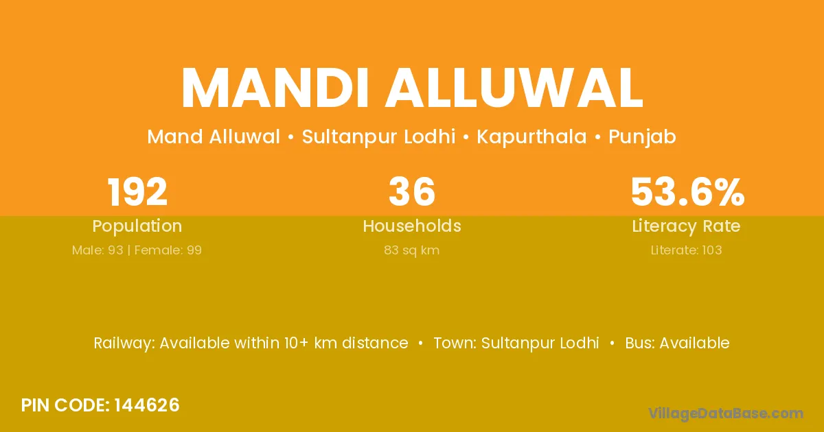 Mandi Alluwal village has a total population of 192 people, of which 93 are males and 99 are females.