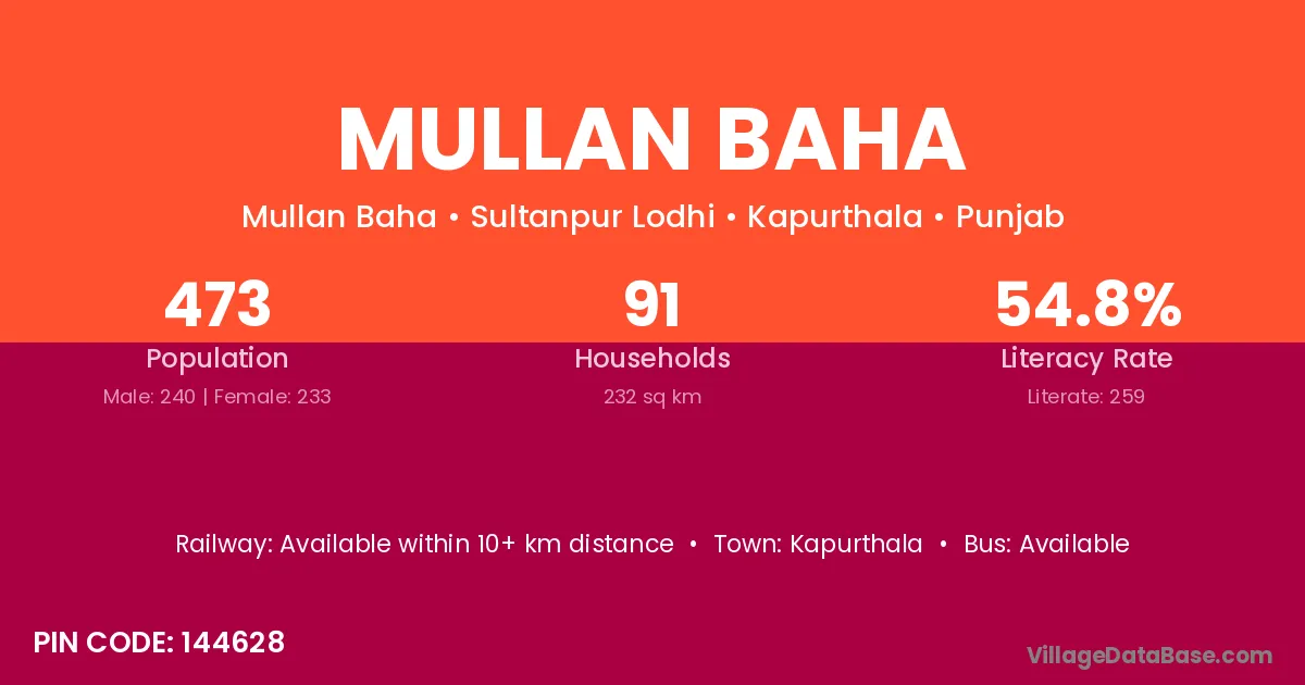 Mullan Baha village has a total population of 473 people, of which 240 are males and 233 are females.