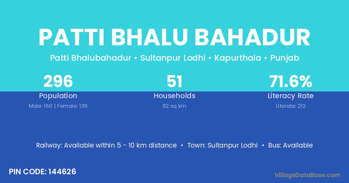Patti Bhalu Bahadur village has a total population of 296 people, of which 160 are males and 136 are females.