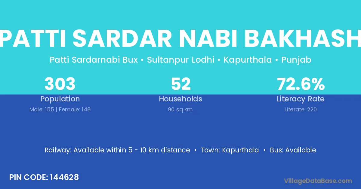 Patti Sardar Nabi Bakhash village has a total population of 303 people, of which 155 are males and 148 are females.