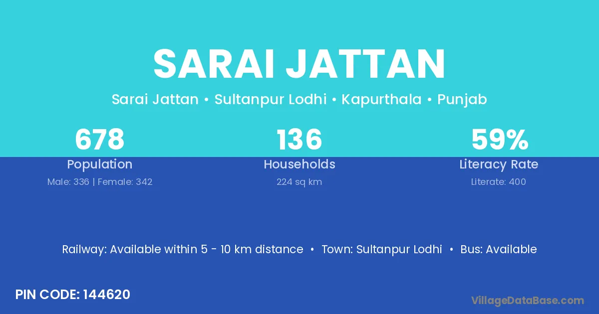 Sarai Jattan village has a total population of 678 people, of which 336 are males and 342 are females.