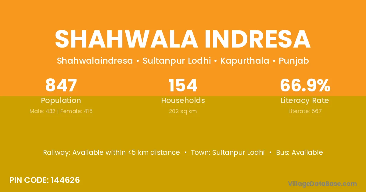 Sultanpur Lodhi is the nearest town to Shahwala Indresa village for major economic activities
