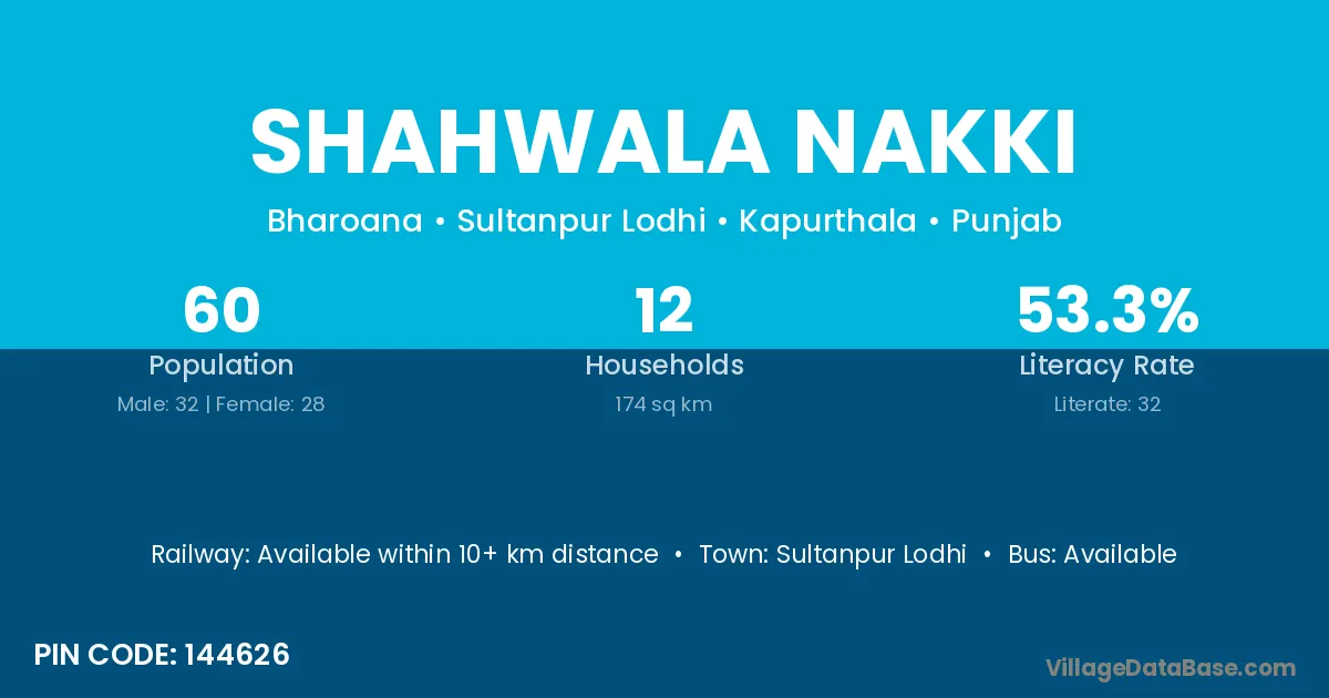 Shahwala Nakki village has a total population of 60 people, of which 32 are males and 28 are females.