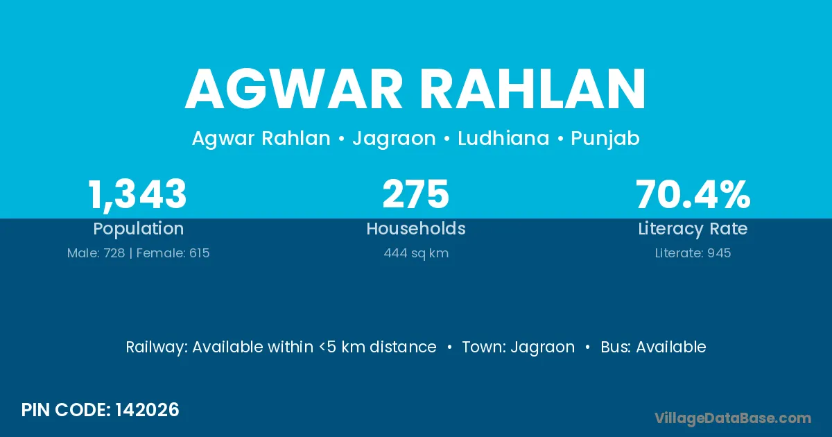 Jagraon is the nearest town to Agwar Rahlan village for major economic activities