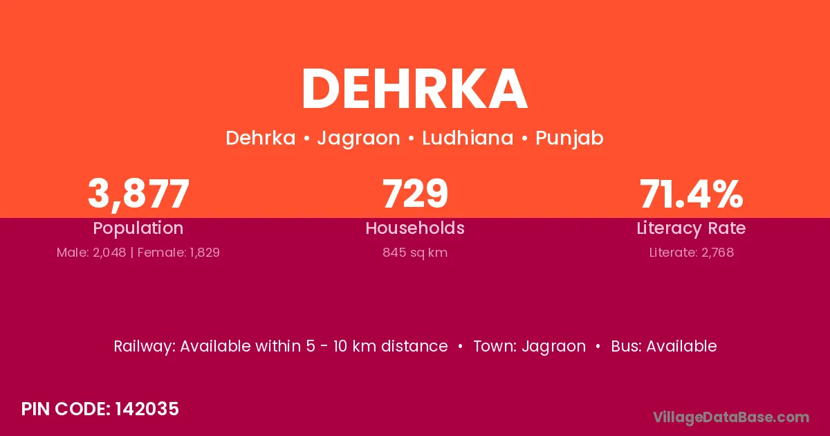 Dehrka village has a total population of 3,877 people, of which 2,048 are males and 1,829 are females.