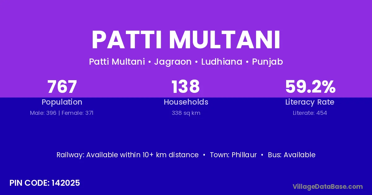 According to Census 2011 information, the village code of Patti Multani village is 142025.
