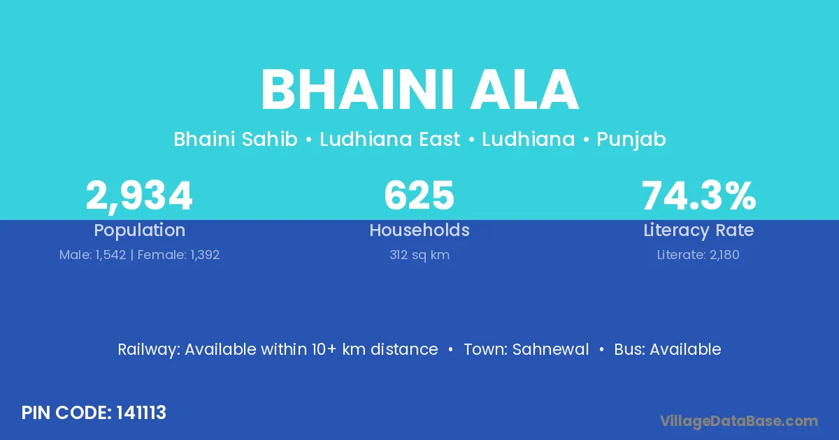 According to Census 2011 information, the village code of Bhaini Ala village is 141113.