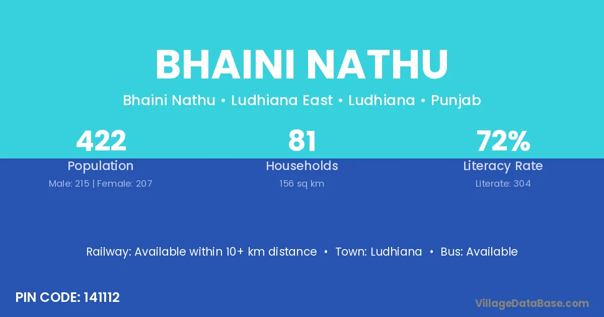 Bhaini Nathu village has a total population of 422 people, of which 215 are males and 207 are females.