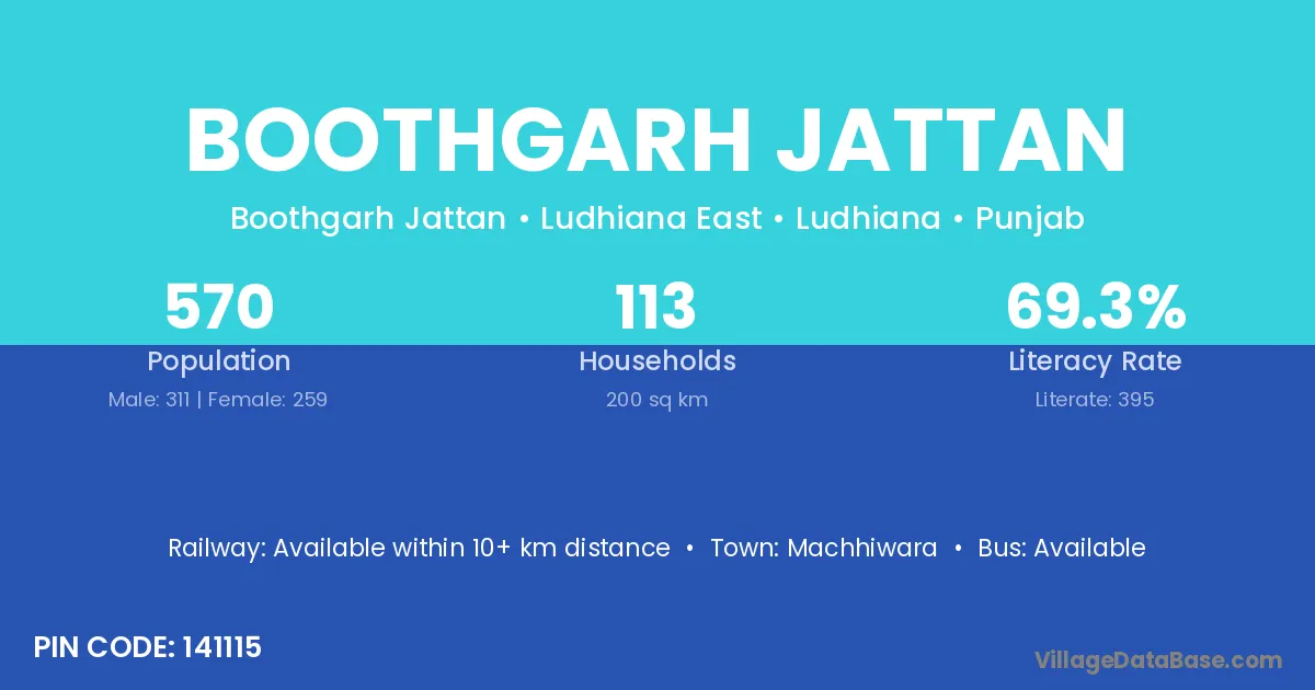 Boothgarh Jattan village has a total population of 570 people, of which 311 are males and 259 are females.