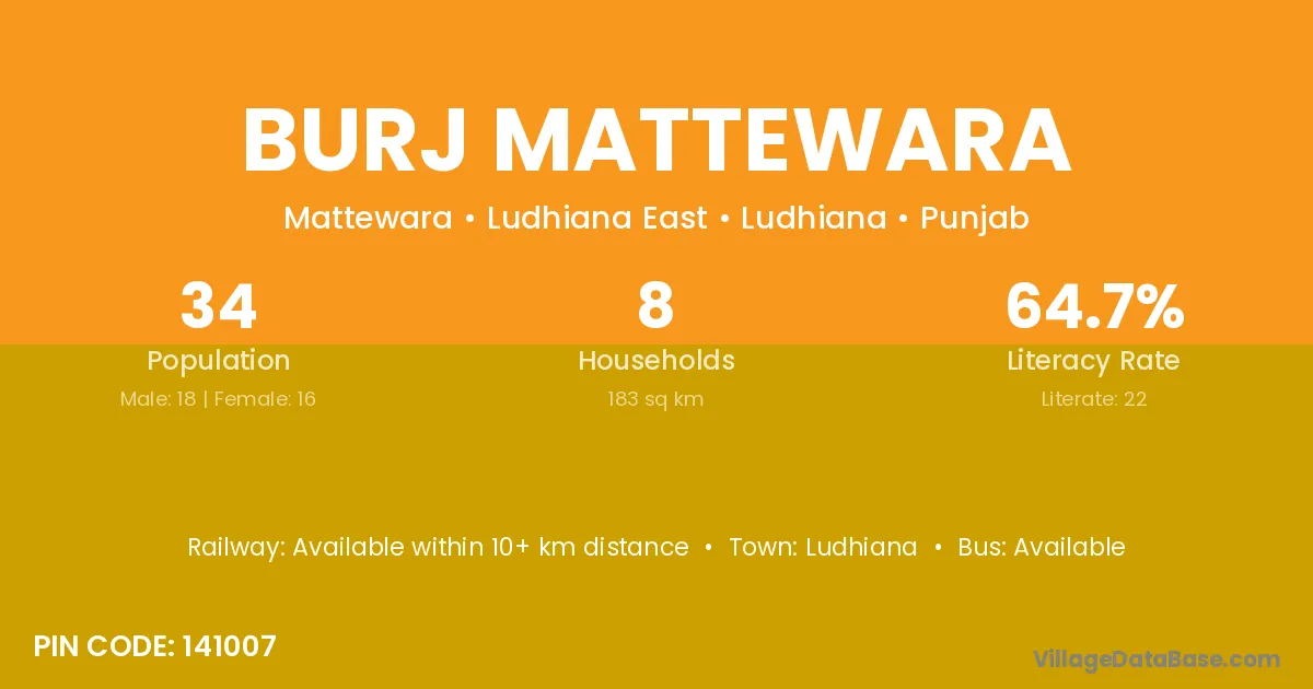 Burj Mattewara village has a total population of 34 people, of which 18 are males and 16 are females.