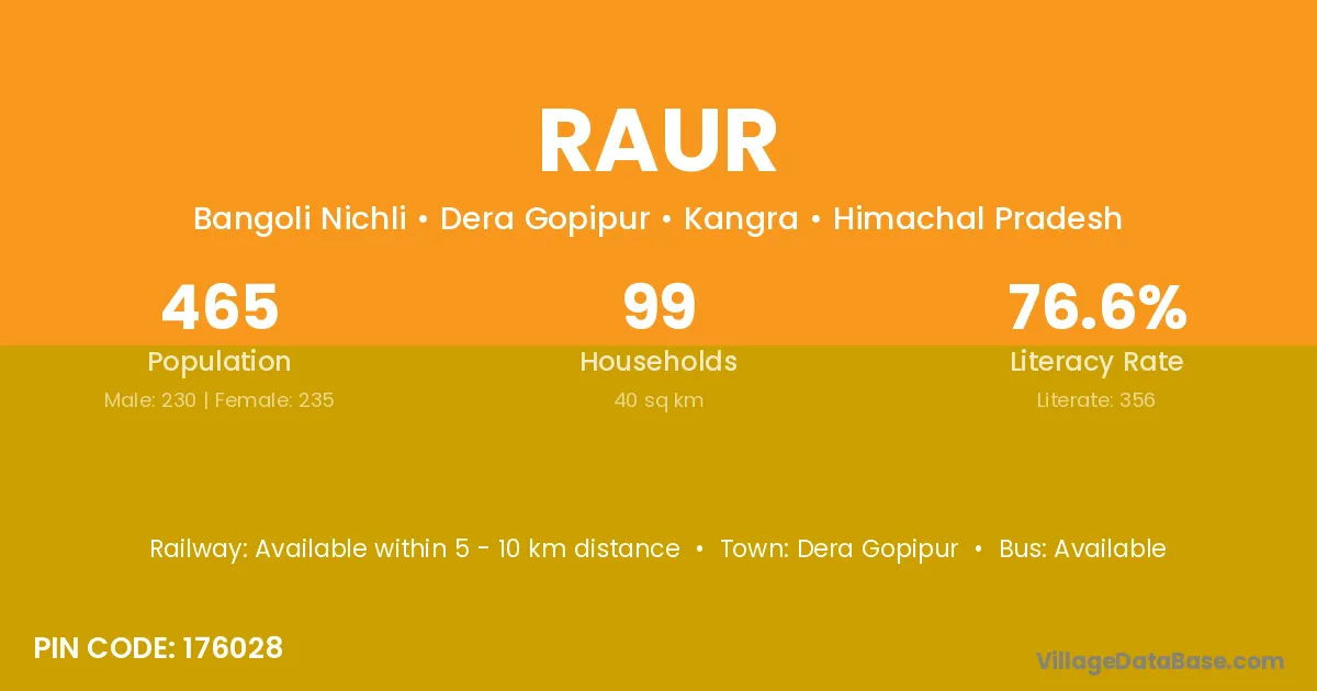 The literacy rate of Raur village is 53.22%. Male literacy stands at 56.98% and female literacy at 48.89%.