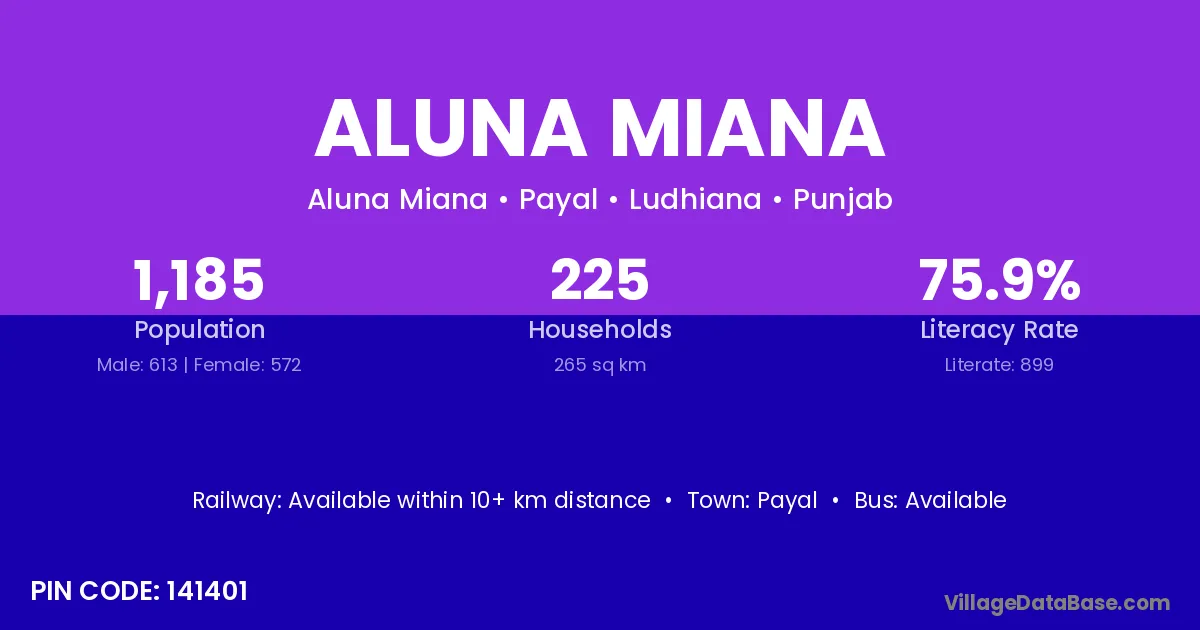 Aluna Miana village has a total population of 1,185 people, of which 613 are males and 572 are females.