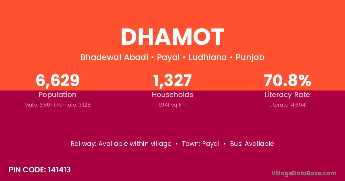 Dhamot village has a total population of 6,629 people, of which 3,501 are males and 3,128 are females.