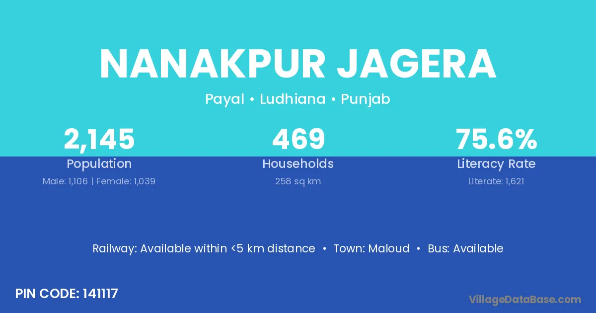 Nanakpur Jagera village has a total population of 2,145 people, of which 1,106 are males and 1,039 are females.