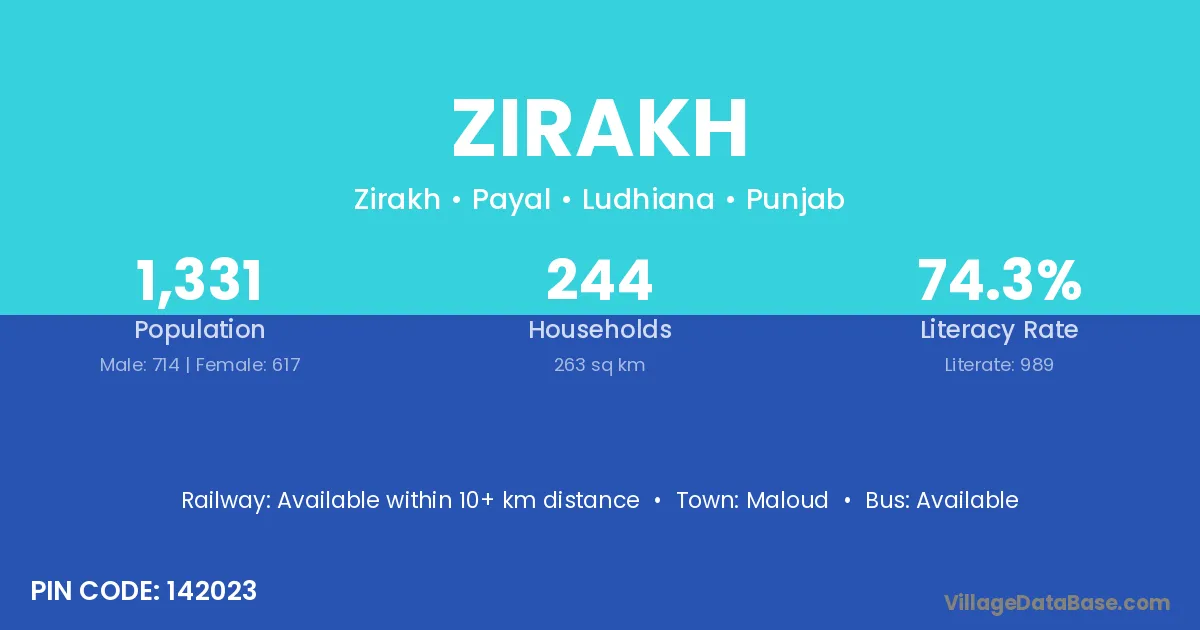 According to Census 2011 information, the village code of Zirakh village is 142023.