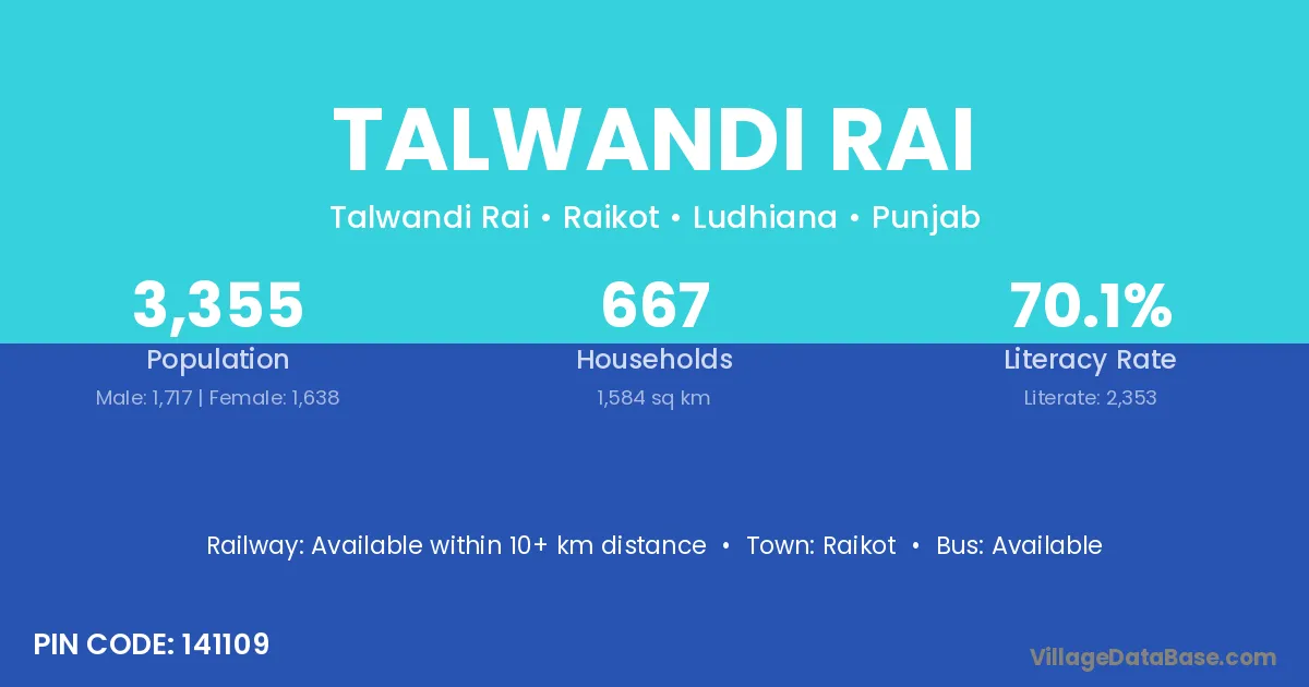 The literacy rate of Talwandi Rai village is 70.13%. Male literacy stands at 75.48% and female literacy at 64.53%.