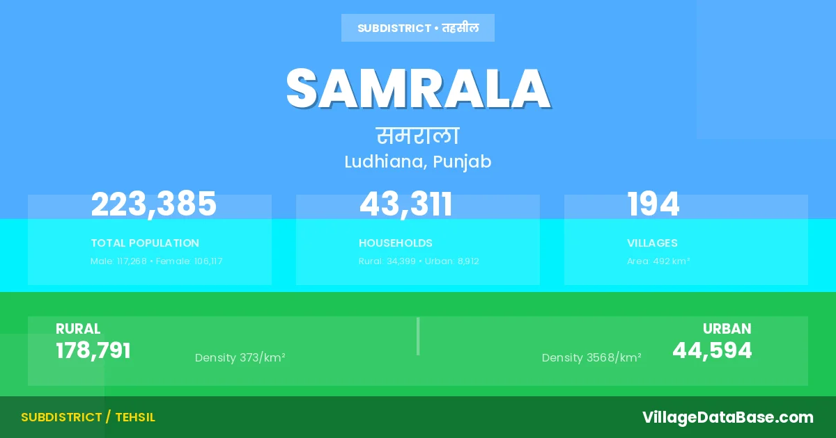 According to the 2011 census The total area of Samrala Tehsil is 492 km², with a population of 223385 people. The population density is 454 inhabitants per square kilometre, and there are approximately 43311 houses in the sub district.