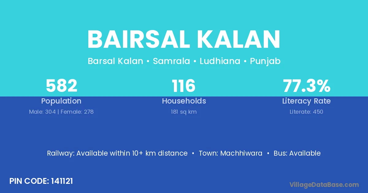 Bairsal Kalan village has a total population of 582 people, of which 304 are males and 278 are females.