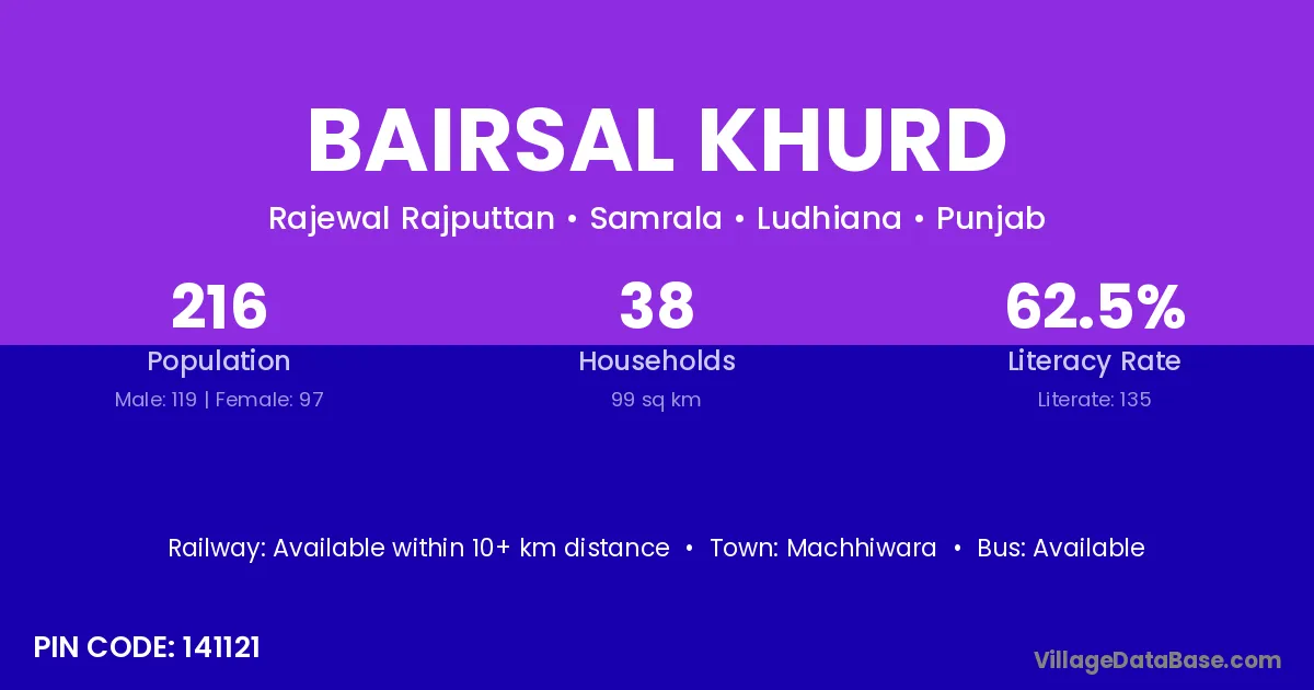 Bairsal Khurd village has a total population of 216 people, of which 119 are males and 97 are females.