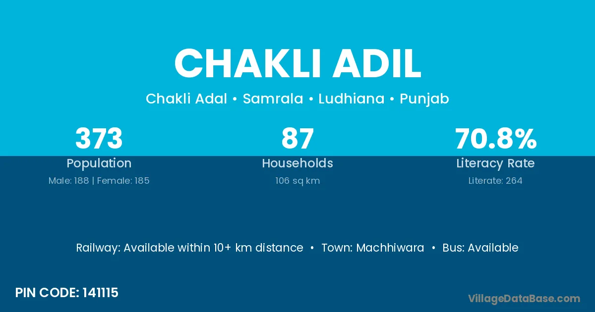 Chakli Adil village has a total population of 373 people, of which 188 are males and 185 are females.