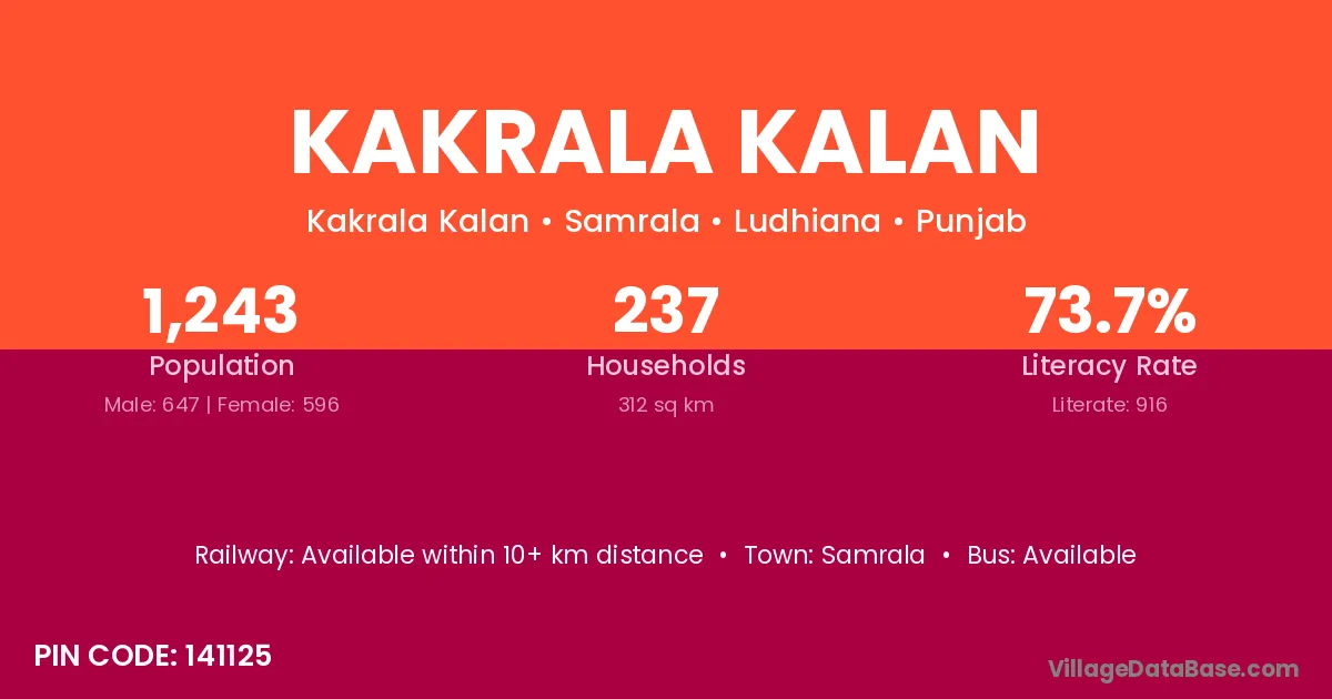 Kakrala Kalan village has a total population of 1,243 people, of which 647 are males and 596 are females.